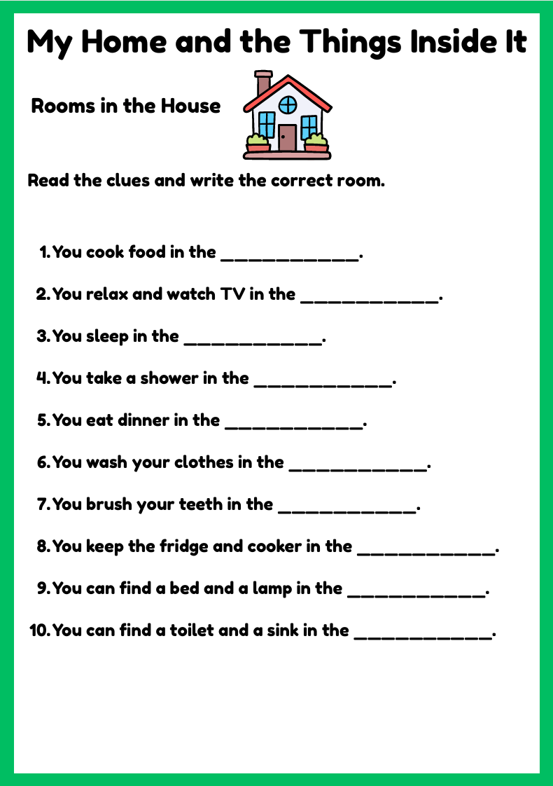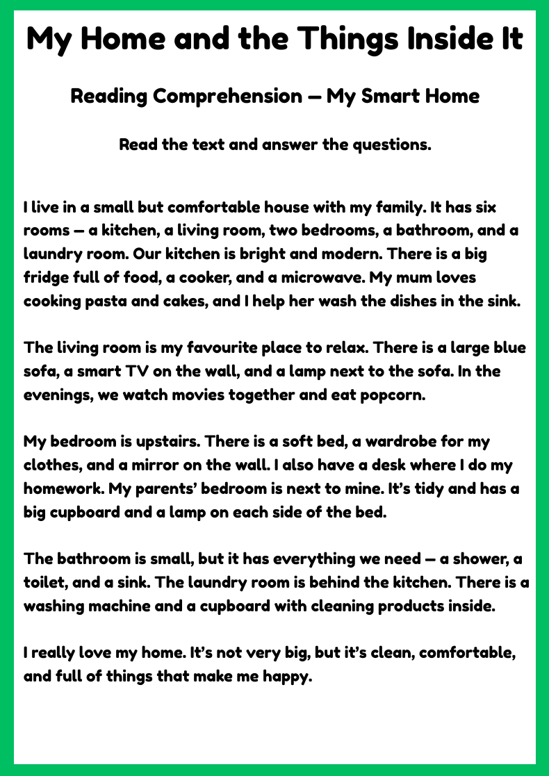 Engaging ESL worksheet pack for children aged 6–10 to learn English words for rooms, furniture, and household appliances. Includes fun matching, fill-in-the-blank, and reading comprehension activities about “My Smart Home.”