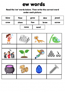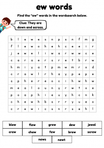 Boost your child’s phonics and spelling skills with this engaging EW word worksheet designed for ages 6–8. Children will read, write, and find “EW” words like flew, grew, and blew through fun sentence writing, clues, and a wordsearch. Perfect for Phase 5 phonics practice at home or in the classroom!