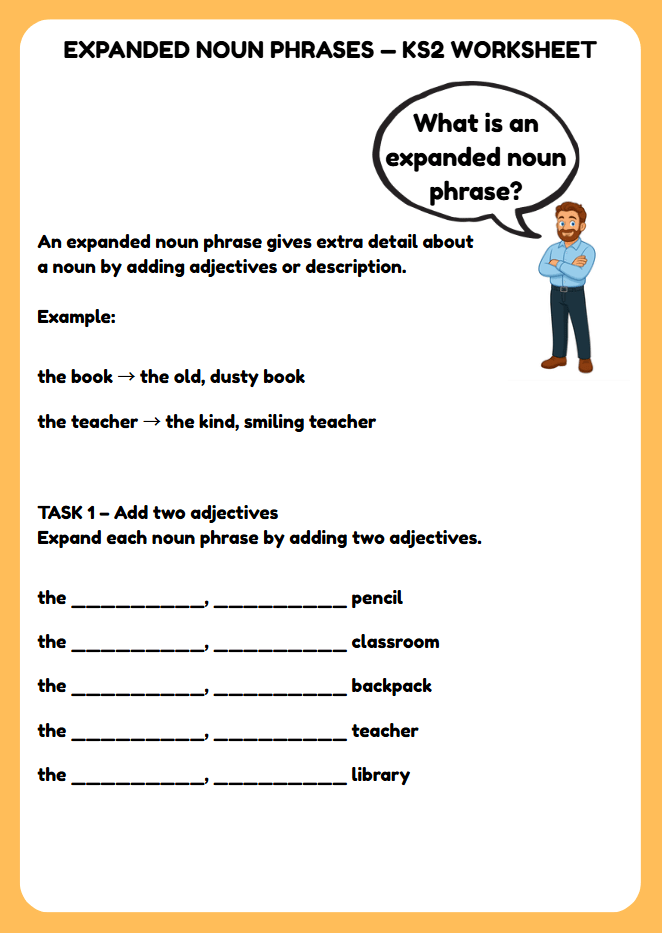 Kids will enjoy the Expanded Noun Phrases Worksheet because it makes learning grammar fun and engaging! This interactive resource invites them to explore language creatively, enhancing their skills while enjoying the process. With colorful activities and stimulating exercises, students aged 7 to 11 will find themselves excited to express their thoughts and ideas through expanded noun phrases. It's a fantastic way to spark their imagination and boost their confidence in writing!
