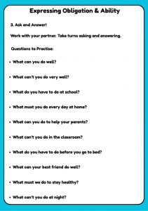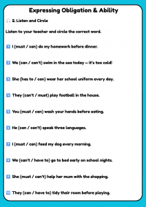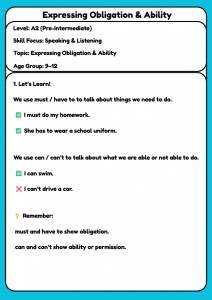 Expressing Obligation & Ability – A2 English Speaking & Listening Worksheet for Kids (Ages 9–12)
