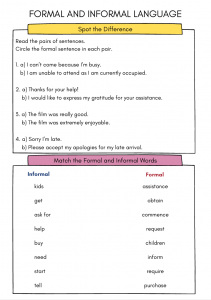 Engaging Formal and Informal Language worksheet for Upper KS2 (Year 5 & Year 6, Ages 9–11). Help children identify, compare and rewrite formal and informal sentences with practical activities, matching tasks, and creative writing challenges. Perfect for classroom lessons, homework, SPaG revision, and building confidence in choosing the right language for different audiences.
