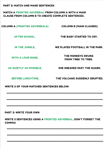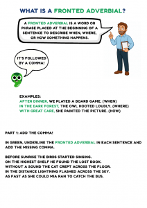 Teach children how to use fronted adverbials with this engaging grammar worksheet. Perfect for ESL learners, this activity helps kids practise sentence starters like ‘After school,’ ‘Suddenly,’ and ‘Without warning’ to add detail and structure to their writing. Ideal for classroom or home learning!