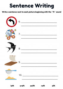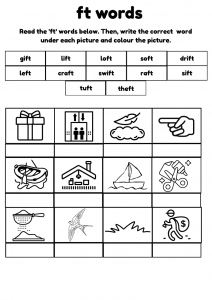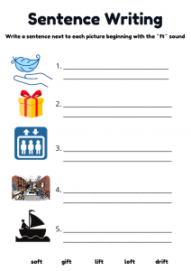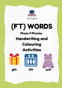 Fun Phase 4 phonics worksheet for children aged 5–7. Practise reading and writing ‘ft’ words like gift, lift, soft, drift, and raft. Includes handwriting, colouring, and sentence writing activities to build phonics, spelling, and reading skills.