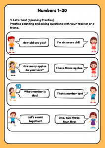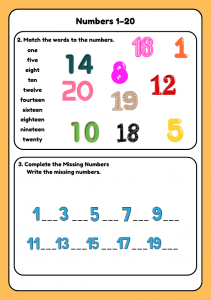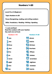 Fun Pre-A1 worksheets designed for children ages 4–7 make learning numbers 1–20 an exciting adventure. Kids thrive in interactive environments, and these engaging ESL activities capture their attention as they practice counting, reading, and writing. The playful approach fosters curiosity and enthusiasm, making number learning feel like a game rather than a task. As they explore numbers, children gain confidence and joy in their learning journey, making every activity a delightful experience.