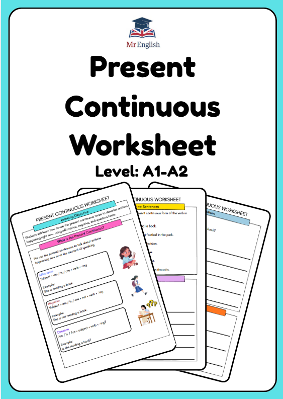 Download this engaging Future Continuous worksheet for ESL learners aged 10–12. Students practise positive, negative, and question forms of the future continuous tense through sentence completion, grammar correction, and writing activities. Ideal for A1–B1 English learners, primary and lower secondary grammar lessons, ESL classrooms, tutors, and home learning.