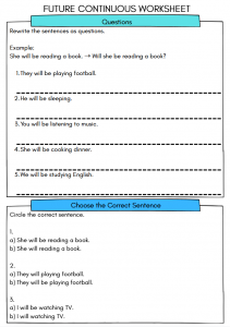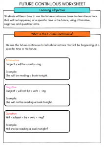 • Facilitates assessment of students' grasp of future continuous usage.