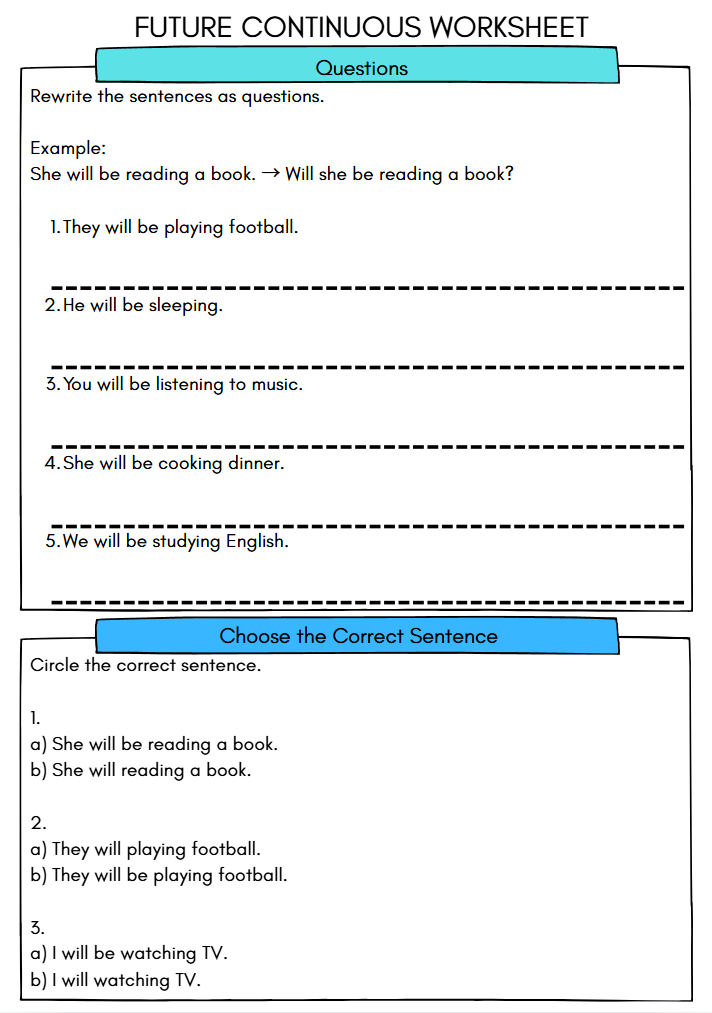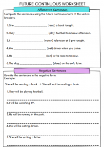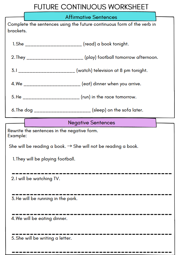 The Future Continuous Worksheet is a fantastic tool for kids aged 10-12, as it transforms learning grammar into an engaging activity. By focusing on positive, negative, and question forms, it encourages students to think creatively and explore language in a fun way. This interactive approach not only helps build their confidence in using English but also sparks their curiosity, making the learning experience enjoyable and memorable. Kids will love the chance to practice while having fun!