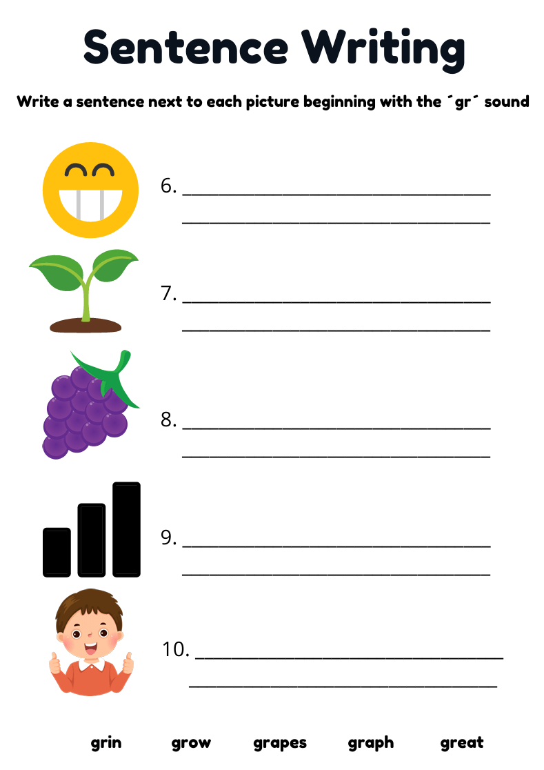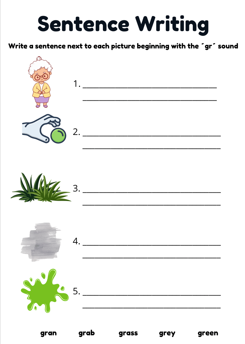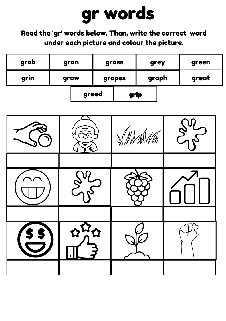 This GR words worksheet for kids (ages 5–7) is perfect for children learning Phase 4 phonics. Kids can practice reading, writing, and spelling words that begin with the gr- consonant blend (e.g. grab, grass, grin, grapes, green, great).