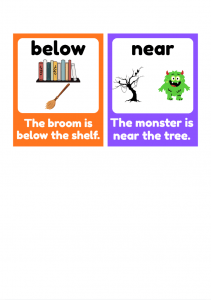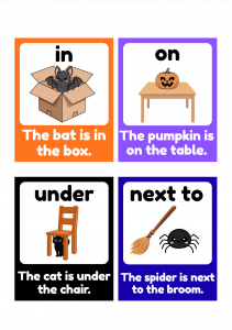 A fun and spooky way to teach English prepositions! These Halloween Preposition Flashcards help young learners practise words like in, on, under, next to, behind, above, between, below, and near using pumpkins, witches, bats, ghosts and more. Perfect for ESL classrooms, homeschooling, and beginner English lessons. Download the printable PDF and make Halloween learning exciting and memorable for kids!