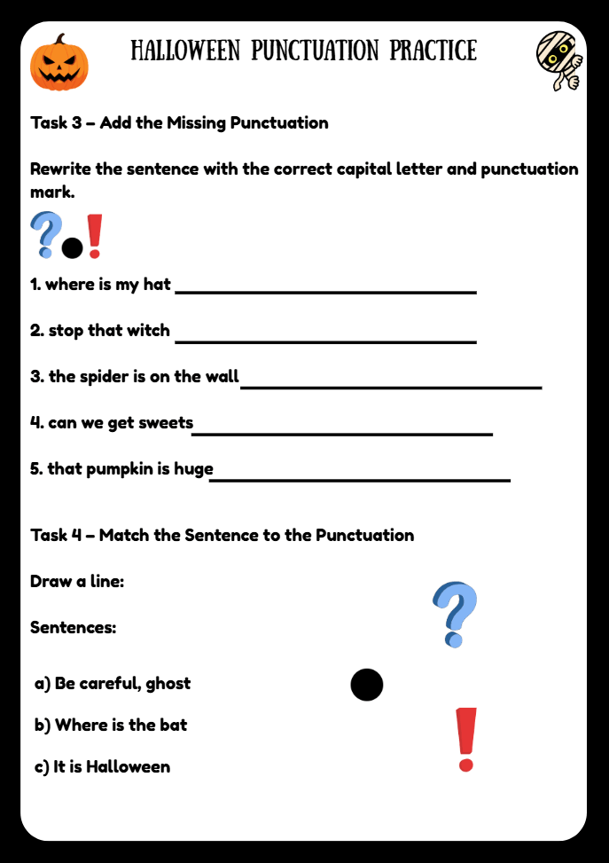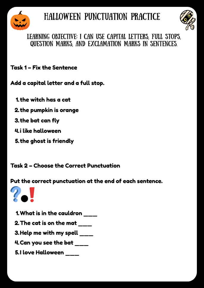 Help children practise capital letters, full stops, question marks, and exclamation marks with this Halloween punctuation worksheet for KS1 (ages 5–7). A fun and friendly activity that builds early writing skills through spooky sentences and simple tasks. Perfect for classrooms, homeschooling, and ESL learners.