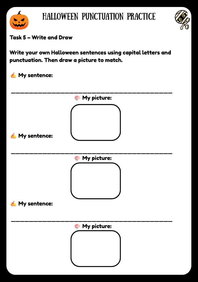 Help children practise capital letters, full stops, question marks, and exclamation marks with this Halloween punctuation worksheet for KS1 (ages 5–7). A fun and friendly activity that builds early writing skills through spooky sentences and simple tasks. Perfect for classrooms, homeschooling, and ESL learners.