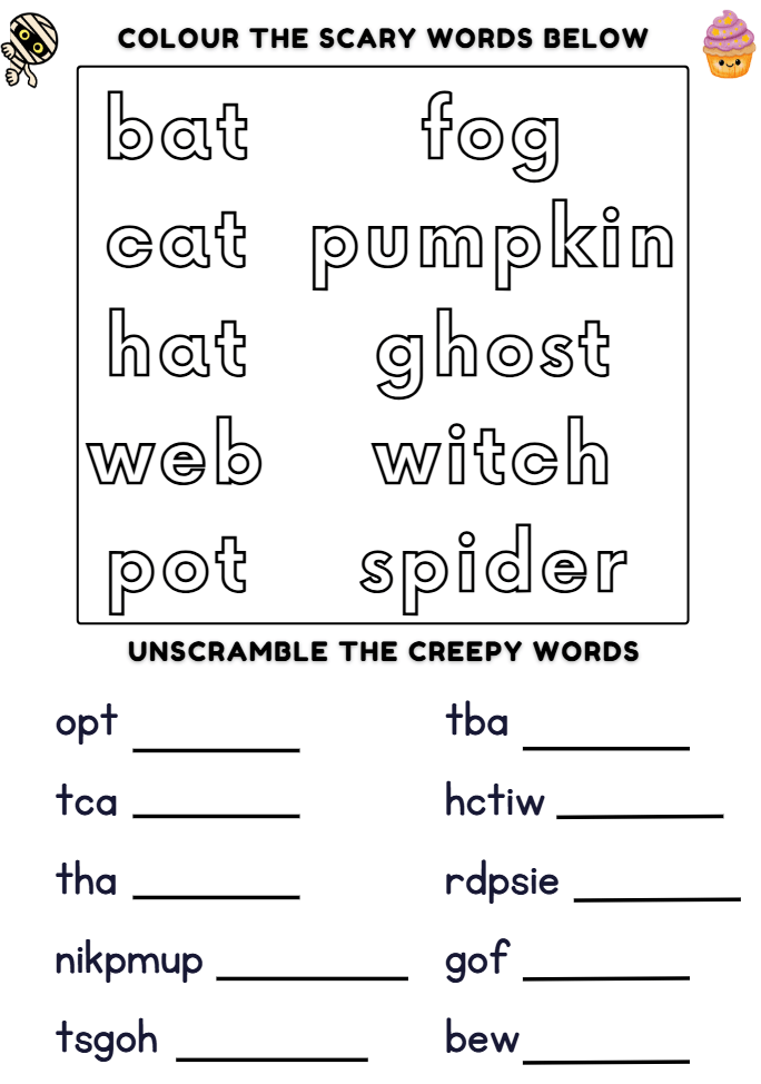 Make handwriting and spelling spooky fun with these Halloween worksheets for KS1 children (ages 5–7)! Kids can trace, read, and write Halloween CVC and phonics words like bat, cat, pot, and witch. Includes word tracing, unscramble tasks, colouring, and a Halloween wordsearch — perfect for classrooms, homeschooling, and ESL learners.