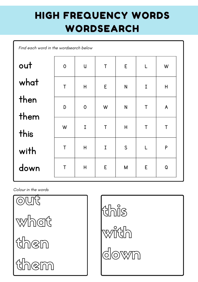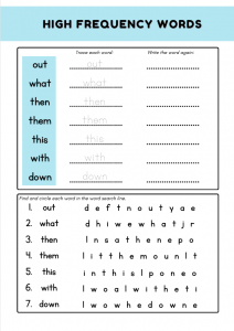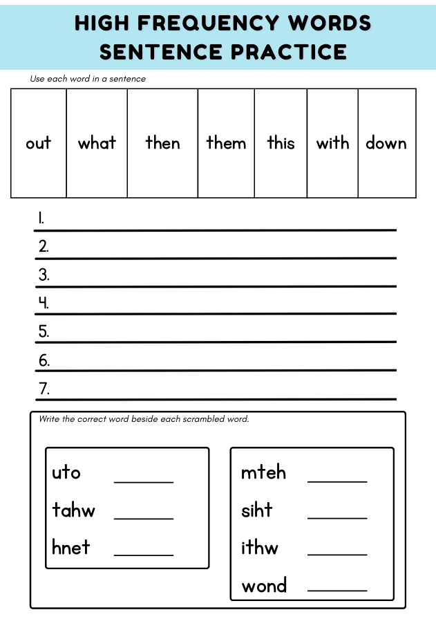 Boost Year 1 children’s reading and spelling skills (ages 5–6) with this engaging high frequency words worksheet! Activities include tracing, wordsearch, unscrambling, and sentence writing using the words: out, what, then, them, this, with, down.