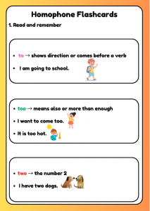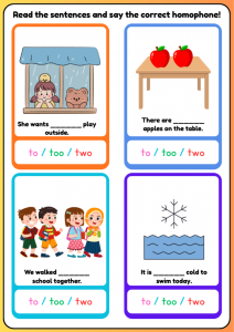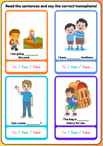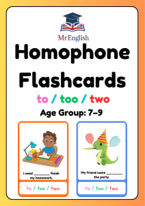 These to, too and two speaking flashcards are designed for children aged 7–9 (Year 3–Year 4). Pupils read each sentence, think carefully about meaning, and say the correct homophone aloud, helping them clearly understand the difference between to, too, and two in context.