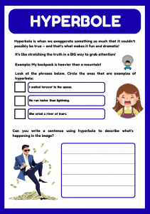 Teach kids aged 7–10 how to use exaggeration in writing with this fun hyperbole worksheet! Perfect for ESL learners and primary classrooms. Includes creative examples.
