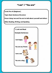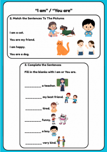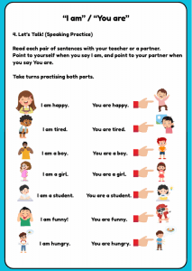 A fun and interactive Pre-A1 English worksheet designed to help young learners understand and use “I am” and “You are” in simple sentences. Children will read, match, write, and speak using these common English phrases while describing themselves and others. Includes colourful examples, matching activities, and speaking prompts to build confidence in everyday conversation.