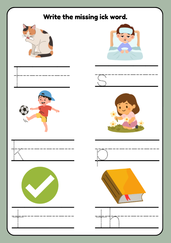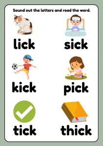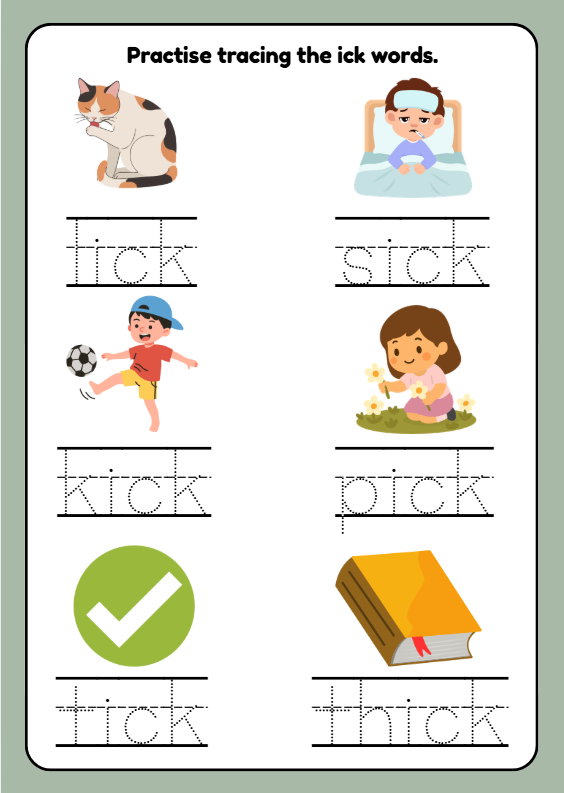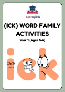 Help children practise reading and spelling ICK word family CVC words with this engaging phonics worksheet pack for Year 1 (ages 5–6). Activities include reading words, tracing, writing practice, picture matching, mazes, and a fun word search featuring words such as lick, sick, kick, pick, tick, and thick. Perfect for KS1 phonics lessons, early readers, intervention groups, tutors, and home learning.