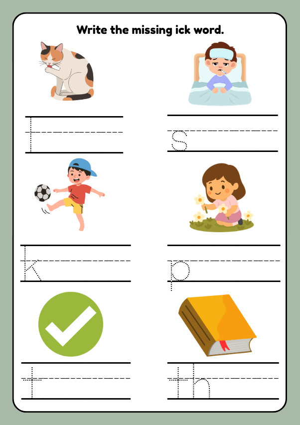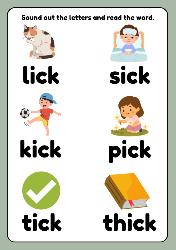 Engaging ICK word family phonics worksheets for Year 1 children (ages 5–6). These printable activities help young learners practise reading, tracing, writing, and recognising words such as lick, sick, kick, pick, tick, and thick. Includes matching activities, mazes, and a word search to build early reading and spelling confidence. Ideal for phonics lessons, ESL learners, and home learning.