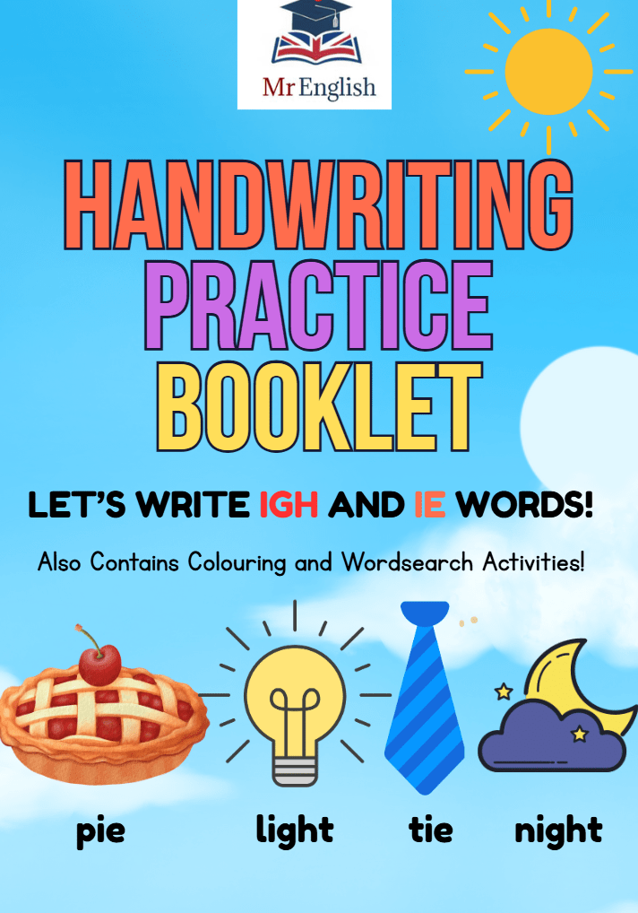Help children aged 5–7 master igh and ie phonics with this fun handwriting booklet! Includes word tracing, sentence writing, colouring, and wordsearch activities—perfect for early literacy and spelling skills.