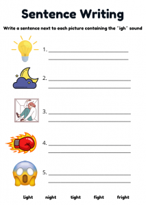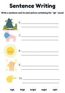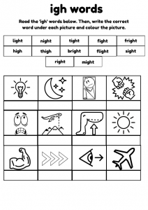 Boost phonics skills for children aged 5–8 with this engaging ‘igh’ words worksheet. Features reading, handwriting, sentence writing, and fun colouring activities to help kids master the ‘igh’ sound. Ideal for early learners and ESL students.