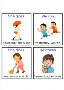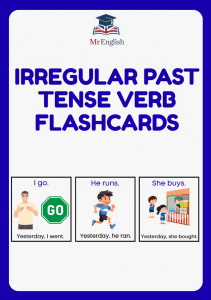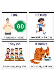 Download colorful irregular verb flashcards for children ages 7–11. Perfect for teaching past tense verbs like go → went and run → ran. Great for ESL lessons, homeschooling, and classroom grammar activities.