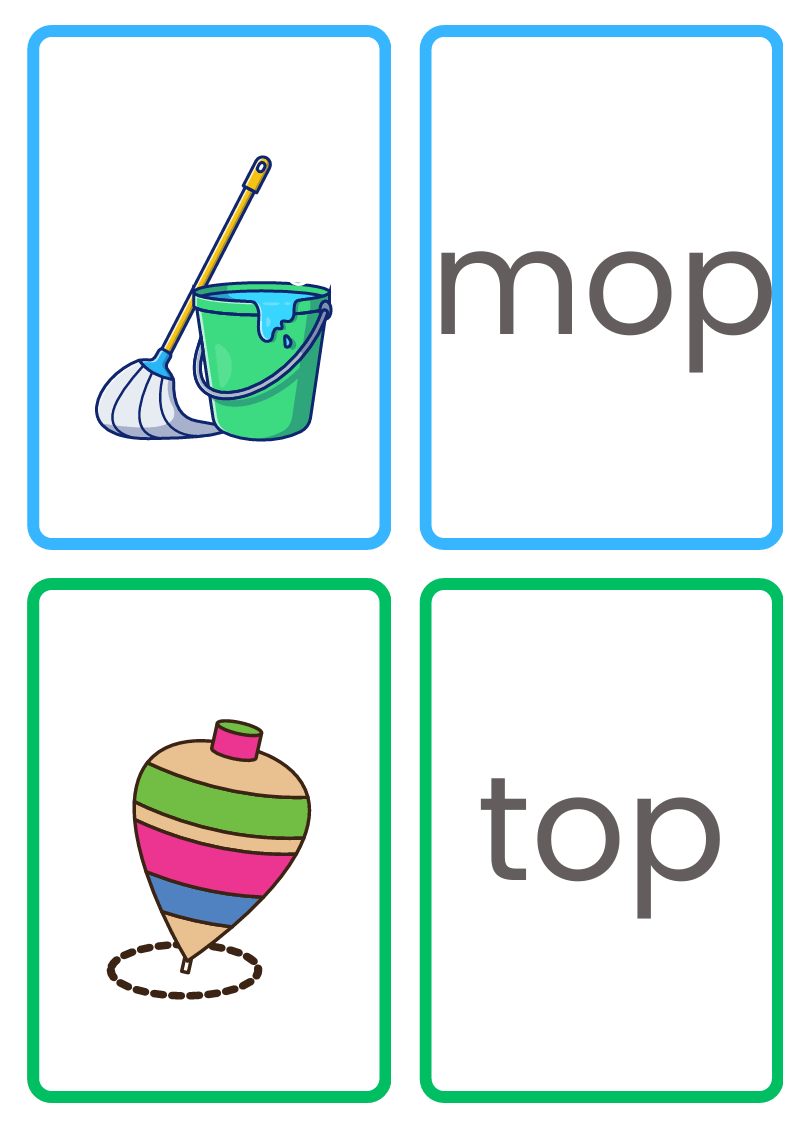 Help your child master -OP words with these fun and engaging flashcards! Perfect for ages 4 to 7, this set includes easy words like hop, mop, pop, and top. Through exciting phonics games, children will improve reading, spelling, and vocabulary skills while building confidence in a playful way.
