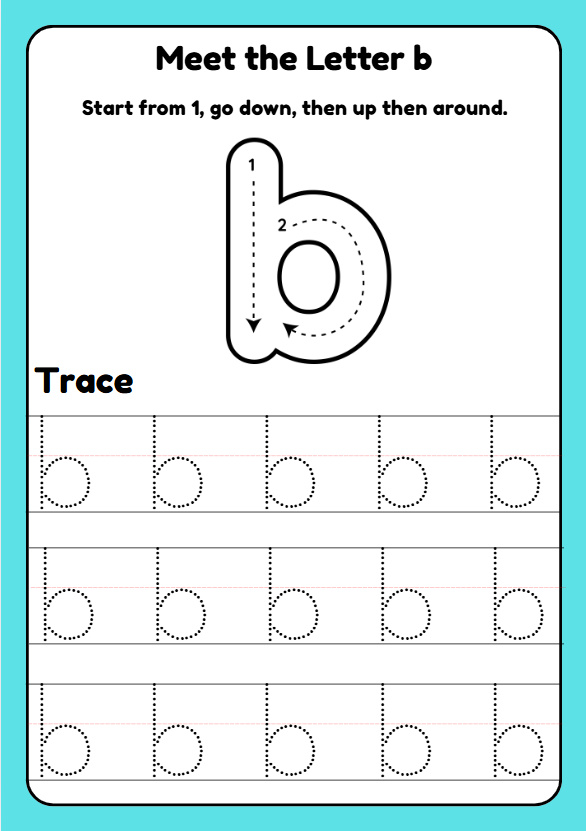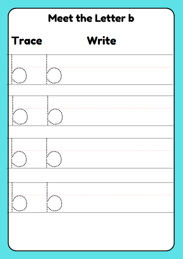 A fun and engaging Letter B formation worksheet for Early Years Reception (ages 4–5). Supports phonics and early writing through tracing, writing, finding, and colouring activities.