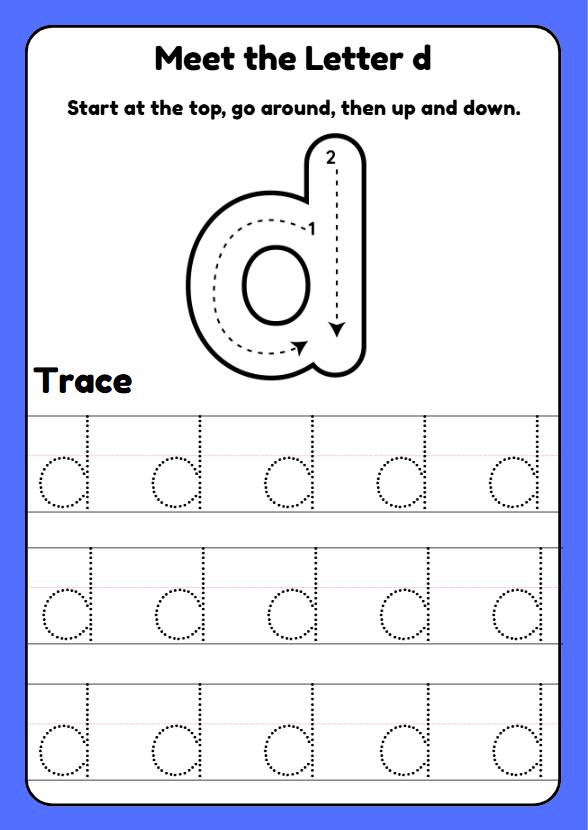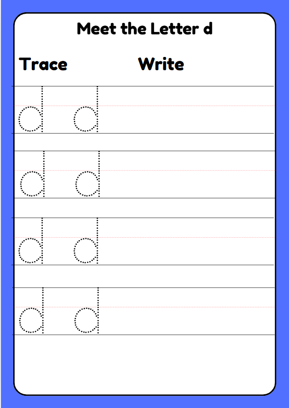 The Letter D Formation Worksheet is designed to engage early learners in a fun and interactive way. At ages 4–5, children are naturally curious and eager to explore new concepts. Worksheets like this one provide a colorful and playful environment, making the learning process enjoyable. Kids will love the satisfaction of mastering letter formation, and the hands-on activities encourage creativity and confidence. Plus, the sense of accomplishment they feel when they see their progress will motivate them to continue learning!