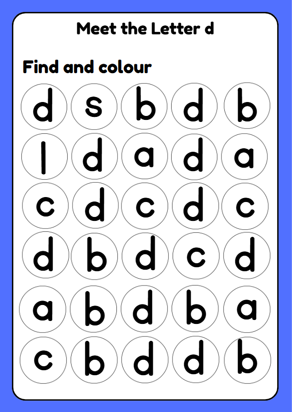 A fun and engaging Letter D formation worksheet for Early Years Reception (ages 4–5). Supports phonics and early writing through tracing, writing, finding, and colouring activities.