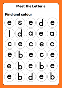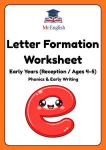 A fun and engaging Letter E formation worksheet for Early Years Reception (ages 4–5). Supports phonics and early writing through tracing, writing, finding, and colouring activities.