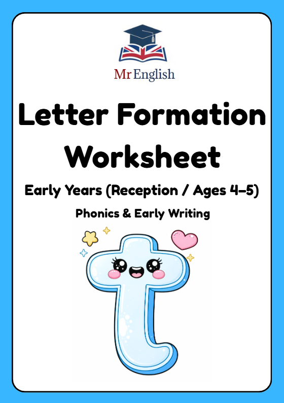 Letter Formation Worksheet – Letter T | Phonics & Early Writing (Ages 4–5)