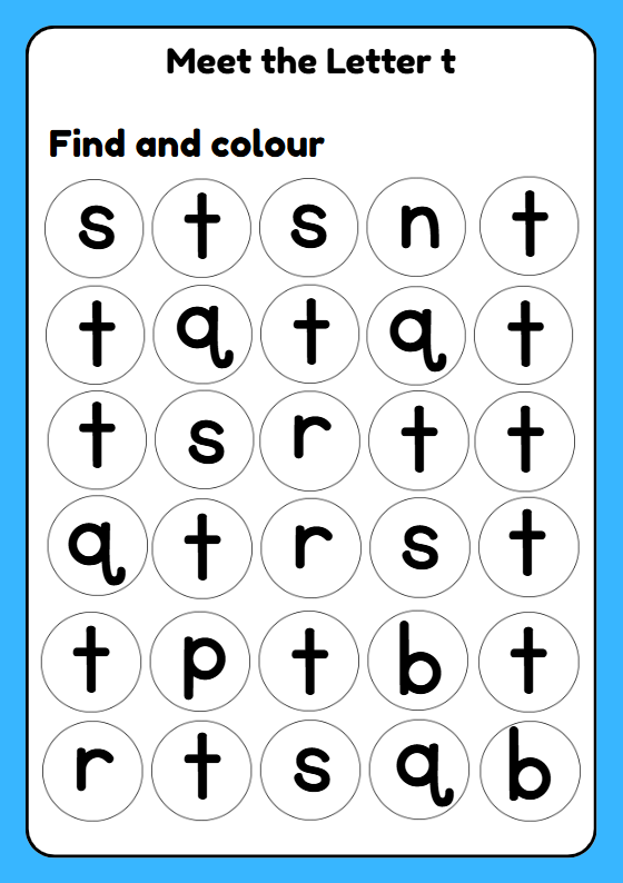 Fun Early Years letter formation worksheet focusing on the letter T. Designed for Reception children aged 4–5, this phonics resource includes tracing, colouring, and sound recognition to support early writing skills.