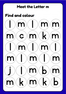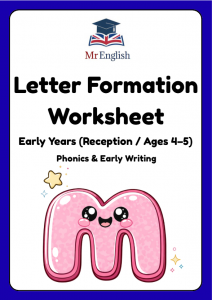Fun letter M formation worksheet for Reception children aged 4–5. Includes tracing, writing, colouring, and phonics activities to support early handwriting and letter recognition.