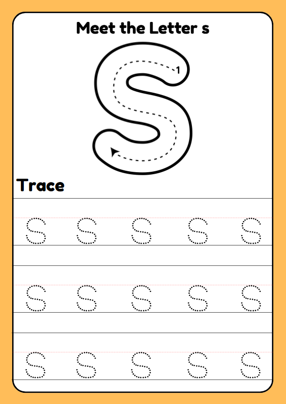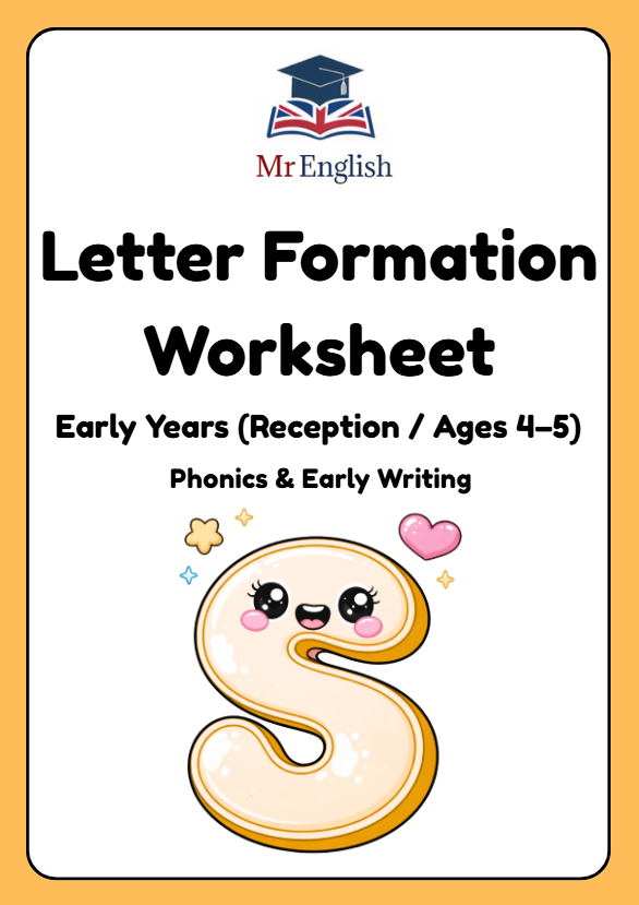 Fun and engaging Letter S formation worksheet for Early Years and Reception children (Ages 4–5). Includes tracing, letter recognition, colouring activities, and phonics-based early writing tasks to support fine motor skills and letter confidence. Ideal for classroom use or home learning.