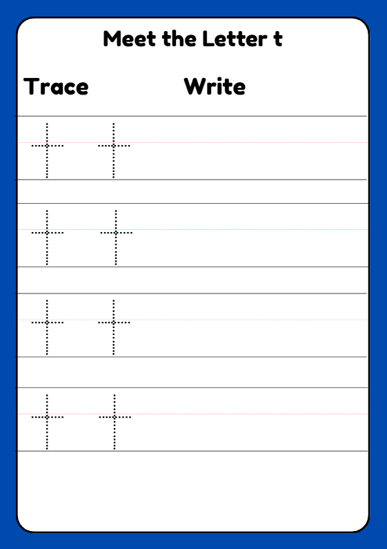 Help your child master the letter t with this fun and engaging Early Years phonics worksheet! Designed for Reception children (ages 4–5), this printable resource includes letter tracing, independent writing practice, letter recognition activities, and colouring tasks. Perfect for developing fine motor skills, early handwriting, and beginning sound recognition. Ideal for home learning, classrooms, and phonics intervention groups.