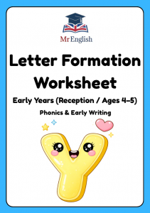 Fun and engaging Letter Y formation worksheet for Reception children (Ages 4–5). Includes tracing, letter recognition, colouring activities, and phonics practice to support early writing and fine motor skills. Perfect for Early Years classrooms and home learning.