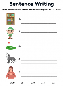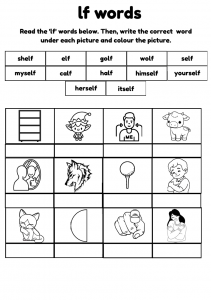 Fun and engaging LF words phonics worksheet for children aged 5–7. Includes reading, handwriting, colouring, and sentence writing activities with words like shelf, elf, wolf, golf, calf, and more. Perfect for Phase 4 phonics practice.