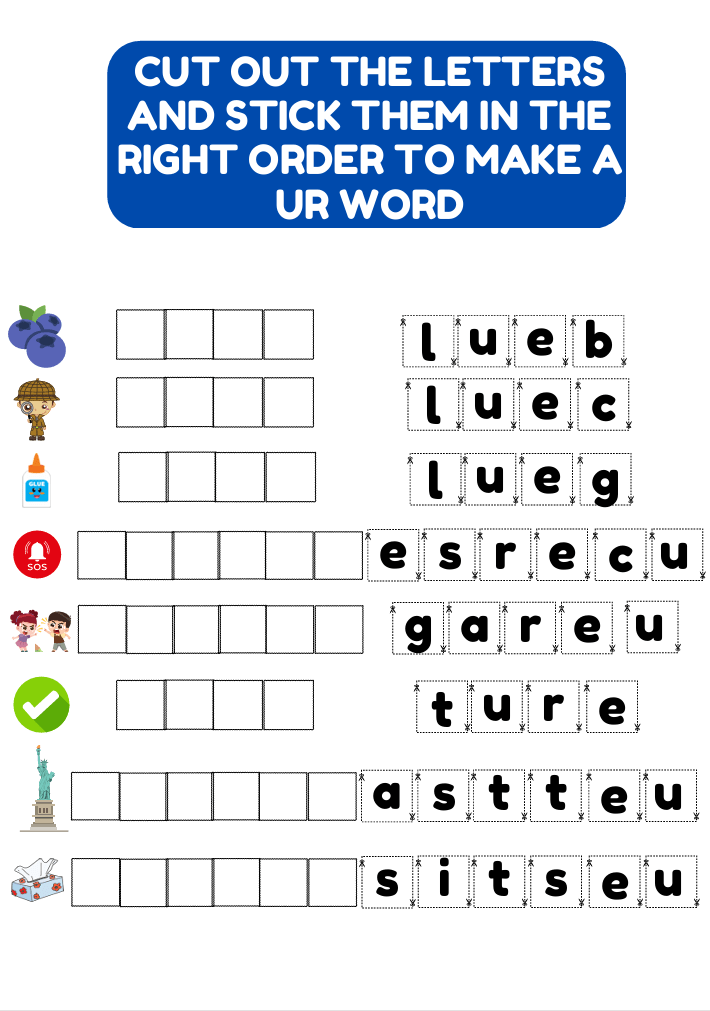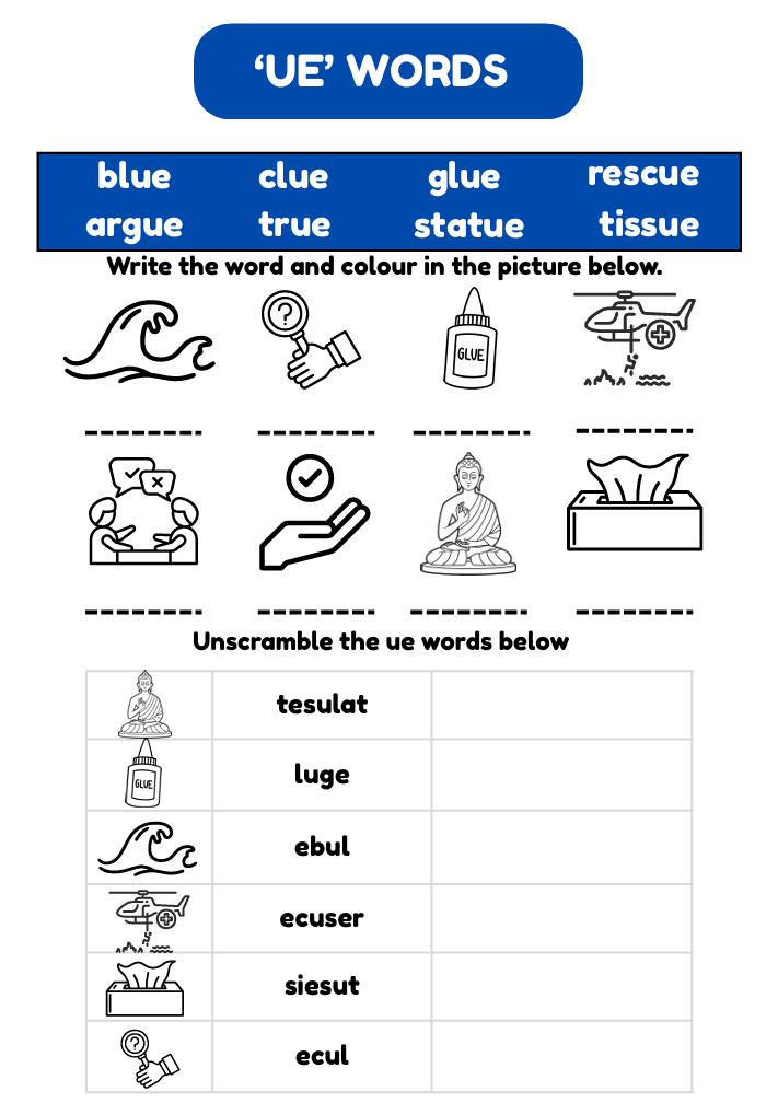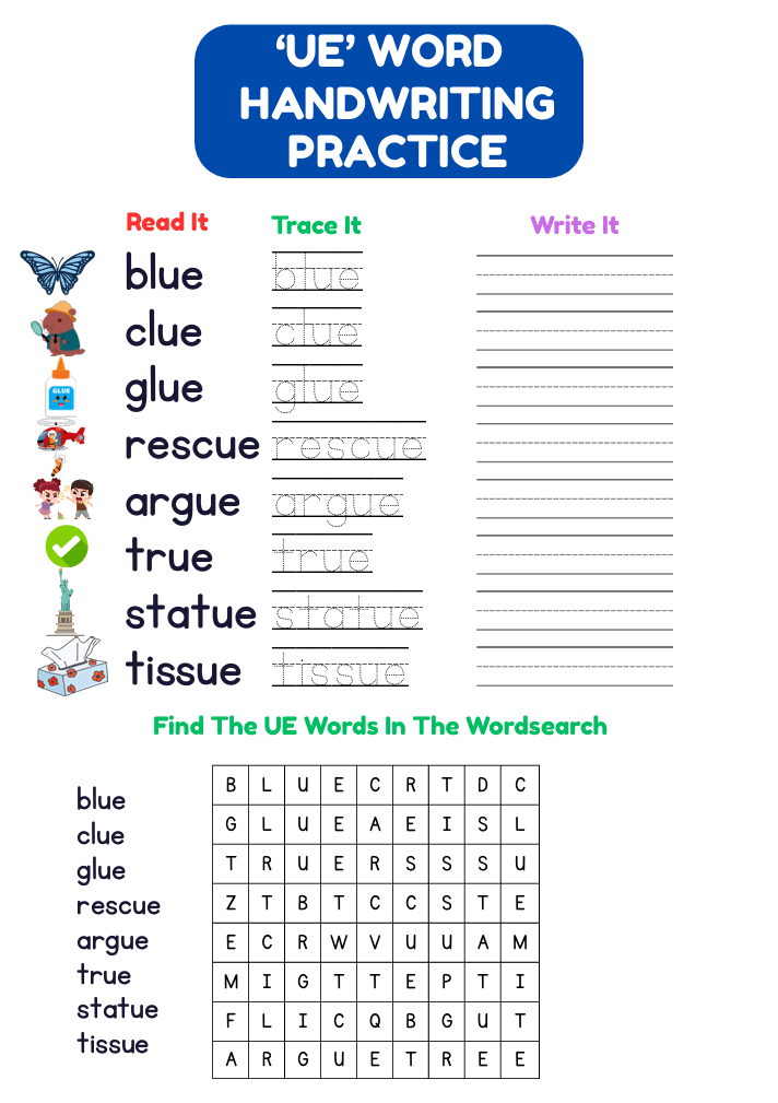 Fun and engaging UE words worksheet for kids aged 6–8. Includes wordsearch, unscramble, tracing, and handwriting practice. Free printable PDF!