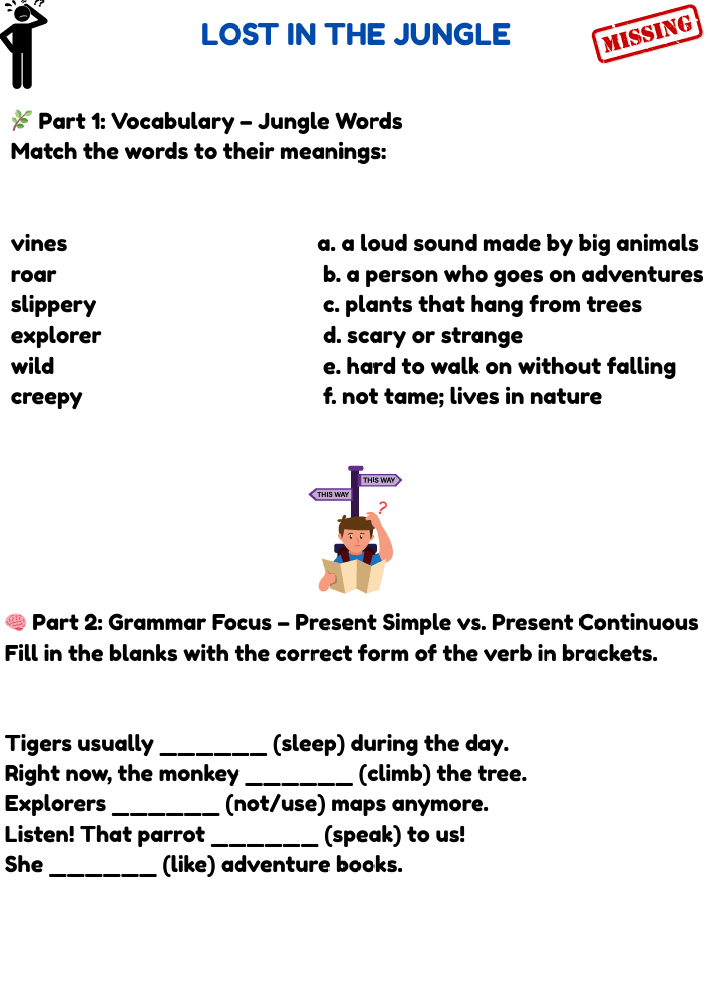 Embark on a wild jungle adventure with this exciting worksheet designed for kids aged 10–12! Through imaginative tasks, students build vocabulary, practise grammar, and develop creative writing skills—all while exploring the sights and sounds of the jungle. Perfect for classroom lessons, homework, or home learning!
