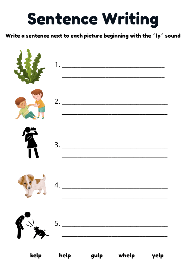 Help children master the “-LP” sound with this engaging worksheet! Perfect for kids aged 5–7, they write the words under pictures and then create their own sentences, practising phonics, spelling, and sentence-building in a fun and interactive way.