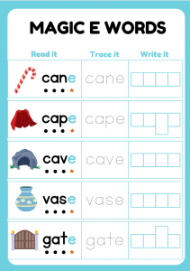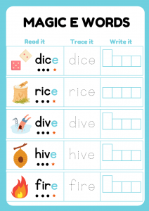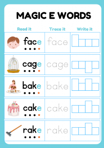 Magic E Words Worksheet offers an engaging way for young learners to enhance their reading and writing skills. Kids aged 5-7 will enjoy the interactive elements of read, trace, and write activities, making learning feel like a fun adventure. The playful nature of the exercises helps to instill confidence in their abilities, sparking excitement for reading and writing. With a focus on creativity and exploration, this worksheet transforms learning into a delightful experience for children.