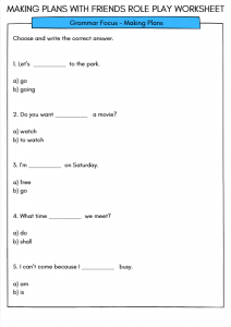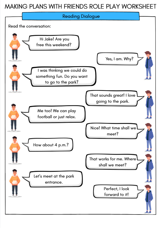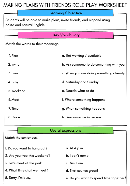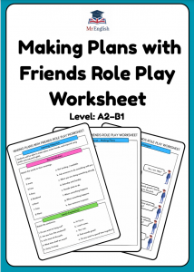 Download this engaging “Making Plans with Friends” role play worksheet for ESL learners aged 9–12. Includes vocabulary, grammar, a reading dialogue, comprehension questions, speech bubble writing, and speaking activities to help students practise real-life English conversations. Ideal for classroom lessons, tutoring, and home learning.