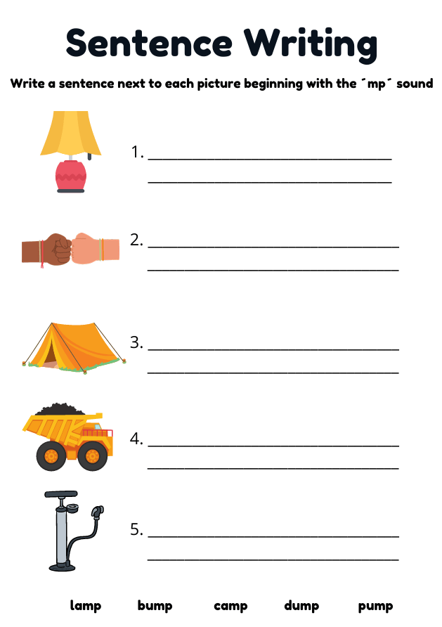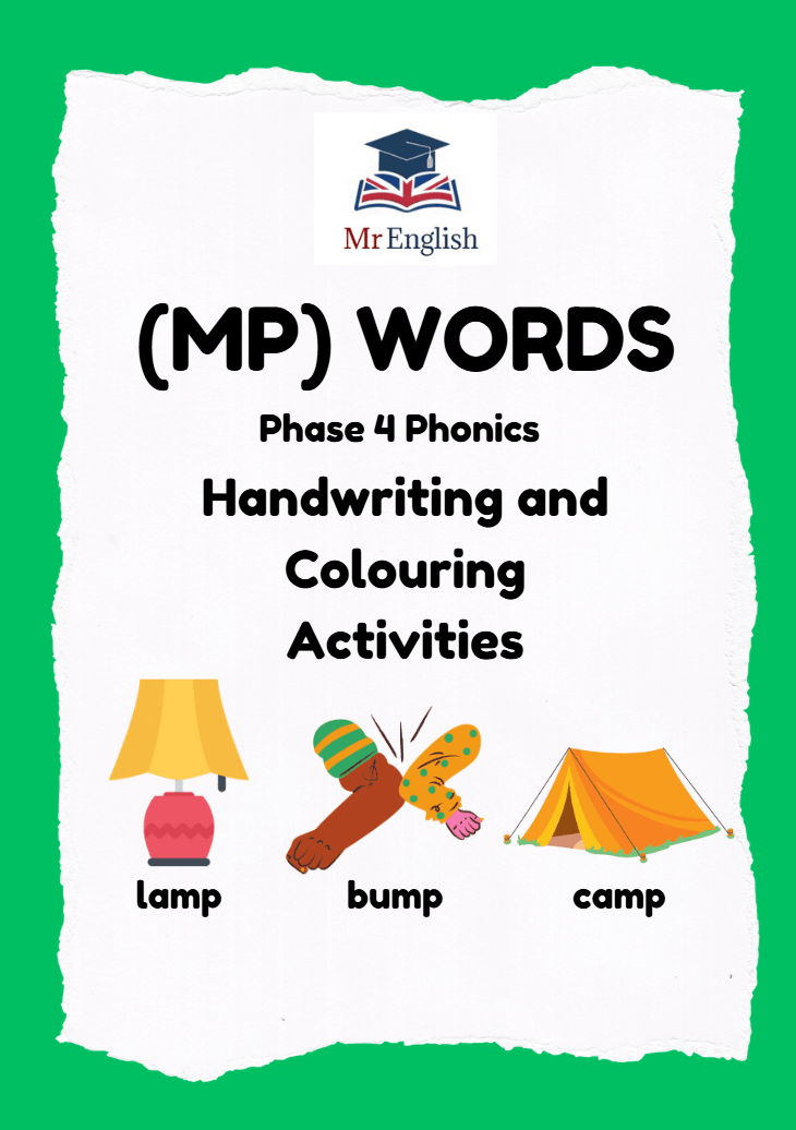 Fun MP words worksheet for Phase 4 phonics. Perfect for children ages 5–7 to practise blending, handwriting, and reading with words like jump, lamp, and stamp. Great for phonics learning at home or in the classroom.