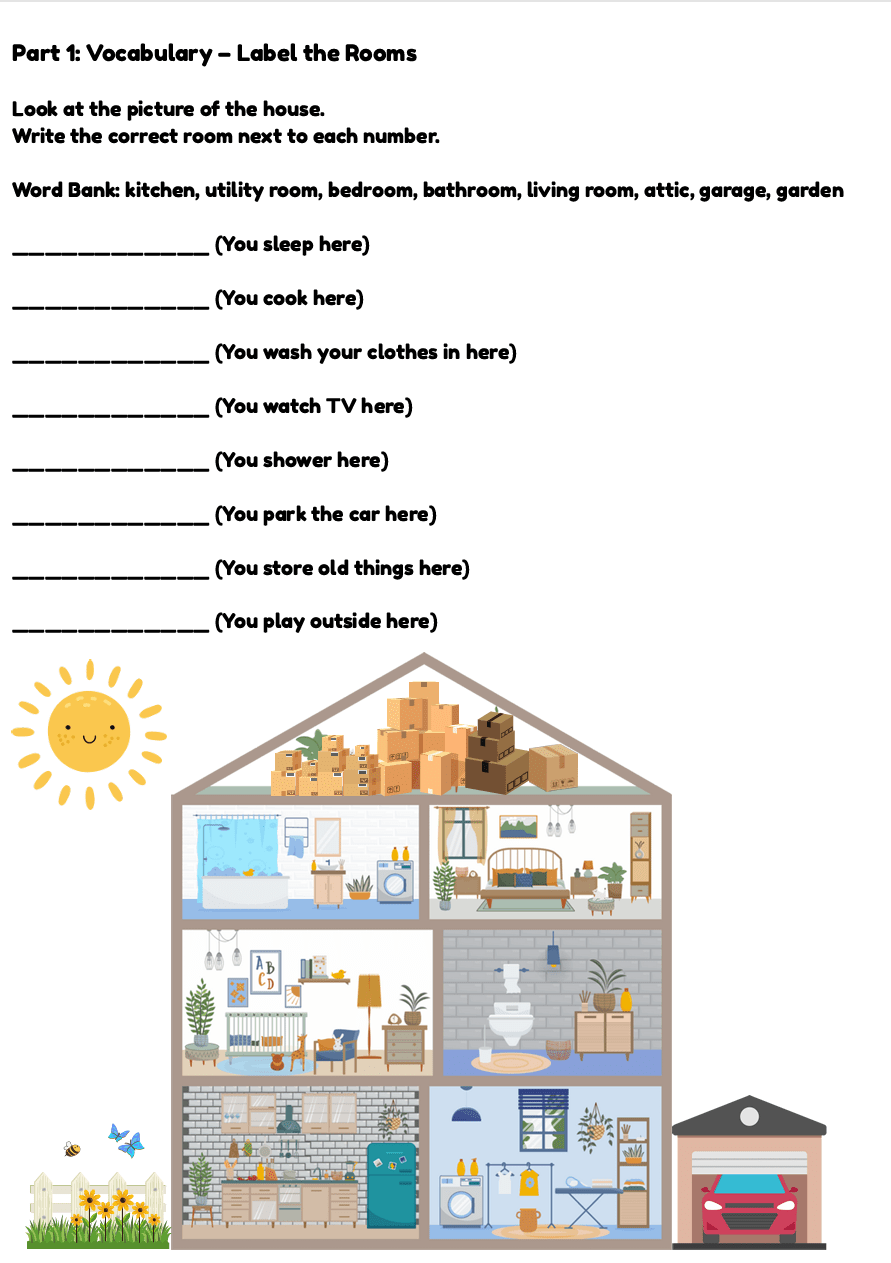 This engaging worksheet helps A1–A2 level ESL students aged 10 to 12 build vocabulary related to the home. Students learn the names of rooms, match furniture to rooms, practise prepositions of place (in, on, under, next to), and write about their own homes. Ideal for classroom or homework use, this worksheet boosts reading, writing, and speaking skills through fun and relatable content.