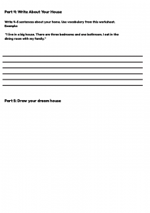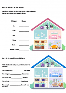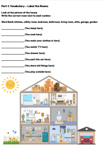 This engaging worksheet helps A1–A2 level ESL students aged 10 to 12 build vocabulary related to the home. Students learn the names of rooms, match furniture to rooms, practise prepositions of place (in, on, under, next to), and write about their own homes. Ideal for classroom or homework use, this worksheet boosts reading, writing, and speaking skills through fun and relatable content.