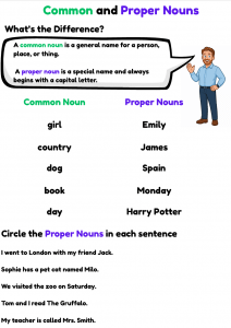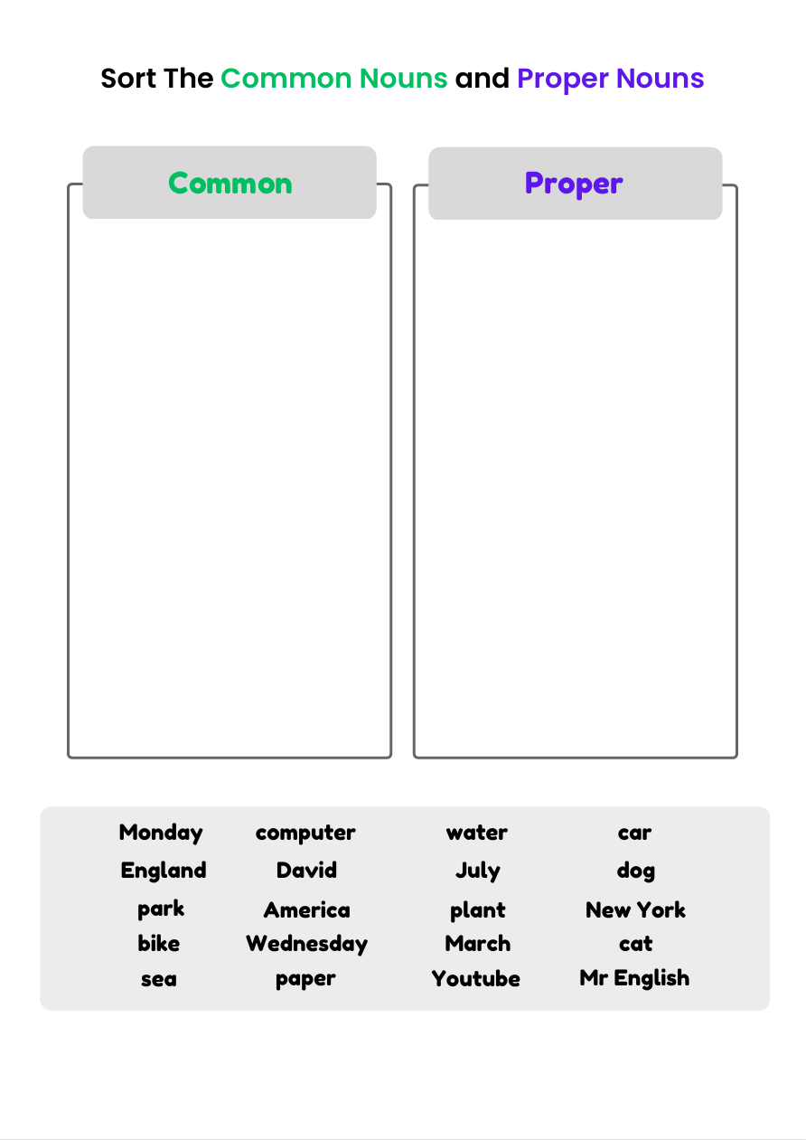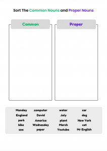 Make learning nouns fun with this interactive worksheet that helps children understand the difference between common and proper nouns. Perfect for ESL learners, this activity includes engaging examples and exercises using words like ‘city’ and ‘London’ or ‘boy’ and ‘Tom.’ Great for classroom or online English lessons!