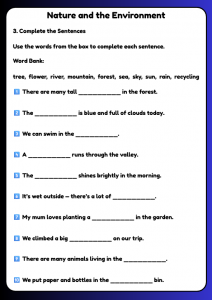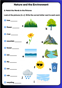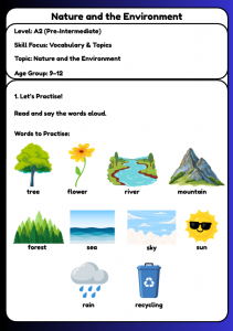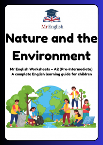 Help children aged 9–12 learn A2 English with this Nature and the Environment worksheet pack. Includes vocabulary practice, matching activities, sentence completion, dialogues, and writing tasks—perfect for ESL lessons and home study.