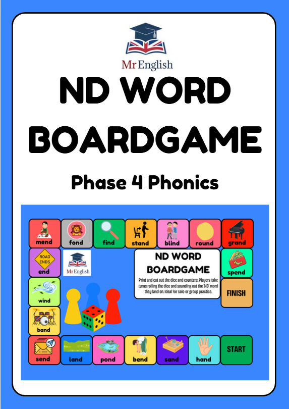 Download this fun ND Word Board Game designed for Phase 4 phonics learners aged 4–7. Perfect for practising final consonant blends, children roll the dice, move around the board, and say ND words such as hand, sand, bend, and wind. Ideal for ESL learners, classrooms, or home learning, this engaging game builds reading, pronunciation, and confidence through play.