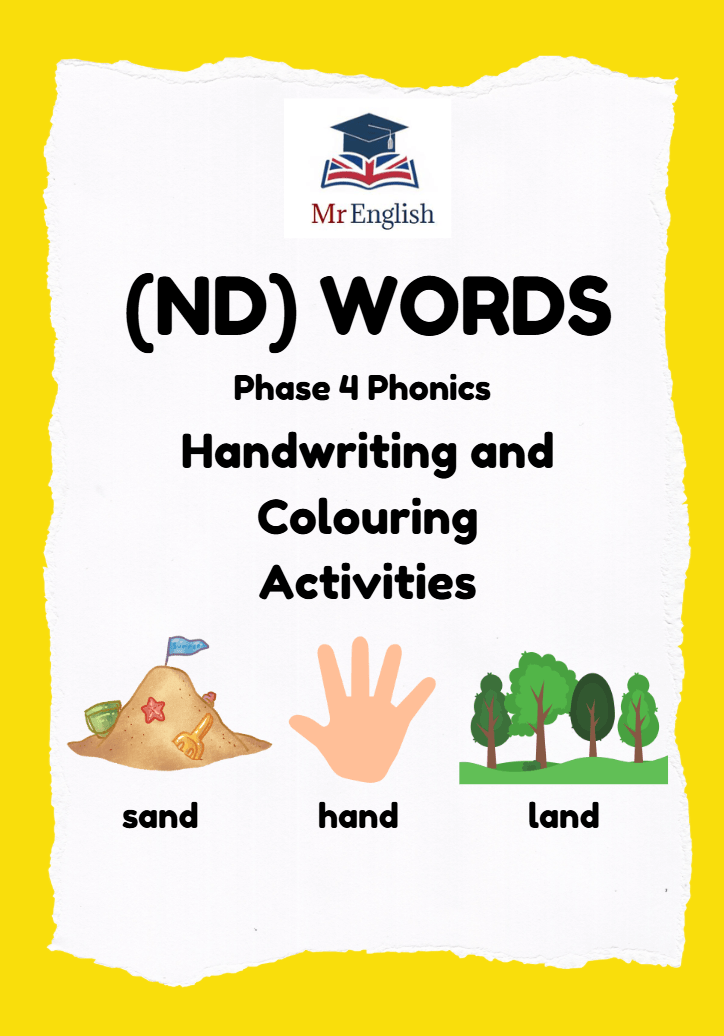 Free ND words worksheet for Phase 4 phonics. Designed for children ages 5–7 to practise blending, handwriting, and reading with words like hand, sand, and bend. Ideal for phonics learning at home or in class.