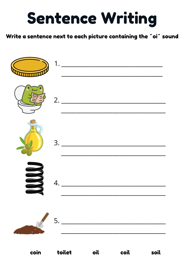 Engaging OI words worksheet for children ages 5–7. Features handwriting practice, colouring activities, and sentence writing with words like coin, soil, and noise. Ideal for phonics learning at home or in the classroom.